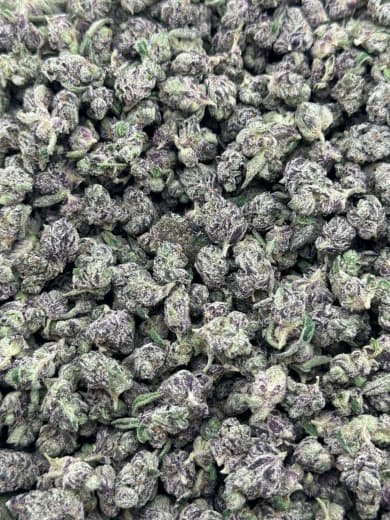 - Appearance: Dense green buds with purple undertones and a frosty layer of trichomes