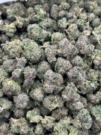 - Appearance: Dense green buds with orange pistils and frosty trichomes, accented by occasional purple streaks